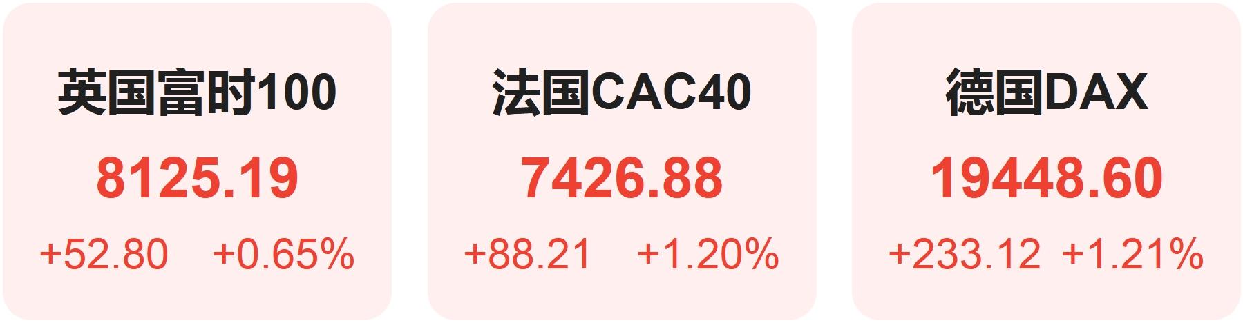 欧洲股市方面,英国富时100指数小幅上涨0.65%,报8125点。法国CAC40指数上涨1.20%,报7427点。德国DAX指数上涨1.21%,报19449点。
