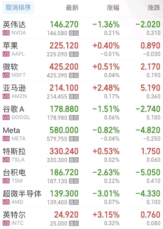 热门美股中,英伟达跌1.36%,苹果涨0.40%,微软涨0.51%,亚马逊涨2.48%,谷歌C跌1.54%,谷歌A跌1.51%,Meta跌0.82%,特斯拉涨0.53%,台积电跌2.63%,超微半导体跌3.02%,英特尔涨3.15%。