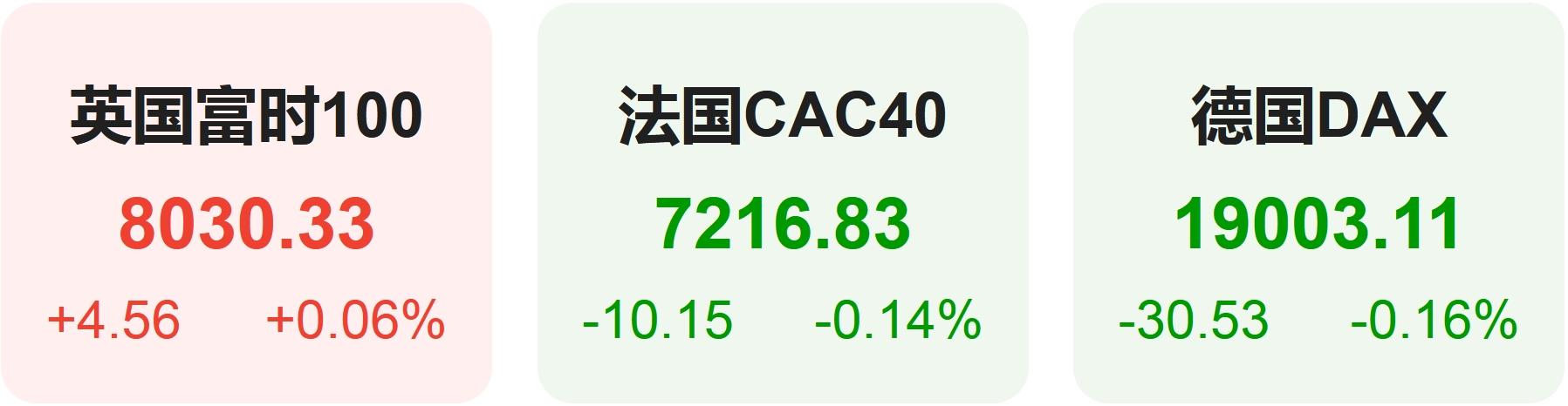 欧洲股市方面,英国富时100指数小幅上涨0.06%,报8030点。法国CAC40指数小幅下跌0.14%,报7217点。德国DAX指数小幅下跌0.16%,报19003点。