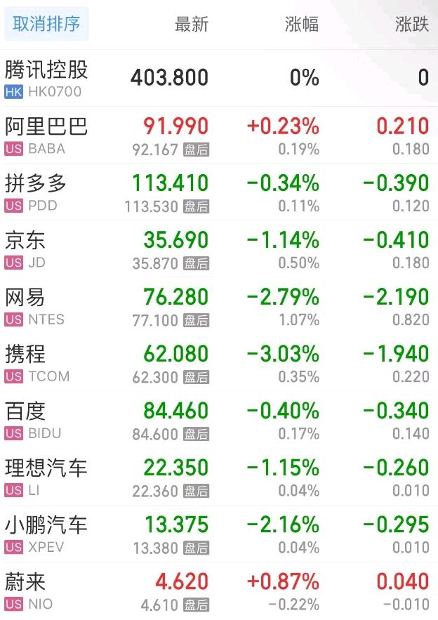 热门中概股方面,腾讯控股(港股)涨0.00%,阿里巴巴涨0.23%,拼多多跌0.34%,网易跌2.79%,携程跌3.03%,百度跌0.40%,理想汽车跌1.15%,小鹏汽车跌2.16%,蔚来涨0.87%。