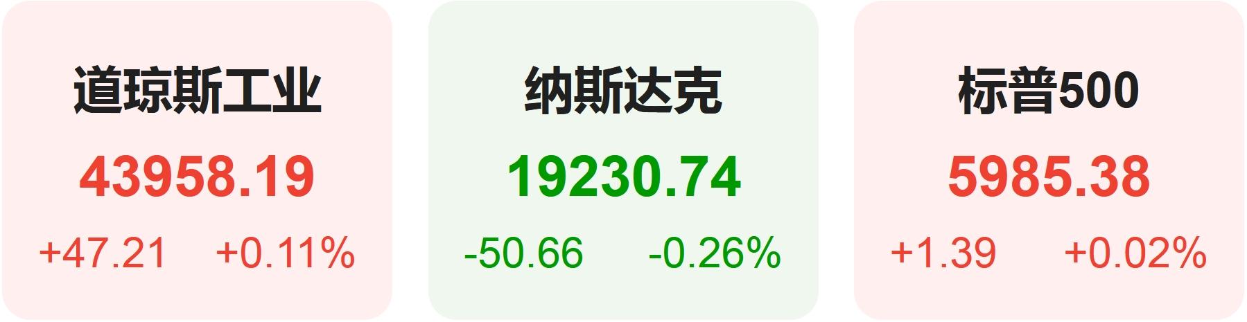 截至收盘,道指涨47.21点,涨幅为0.11%,报43958.19点;纳指跌50.66点,跌幅为0.26%,报19230.74点;标普500指数涨1.39点,涨幅为0.02%,报5985.38点。
