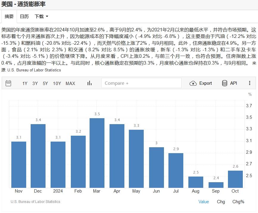 具体来看,美国10月CPI环比上升0.2%,同比上升2.6%,均符合市场预期;核心CPI则与9月一样,继续维持在3.3%。