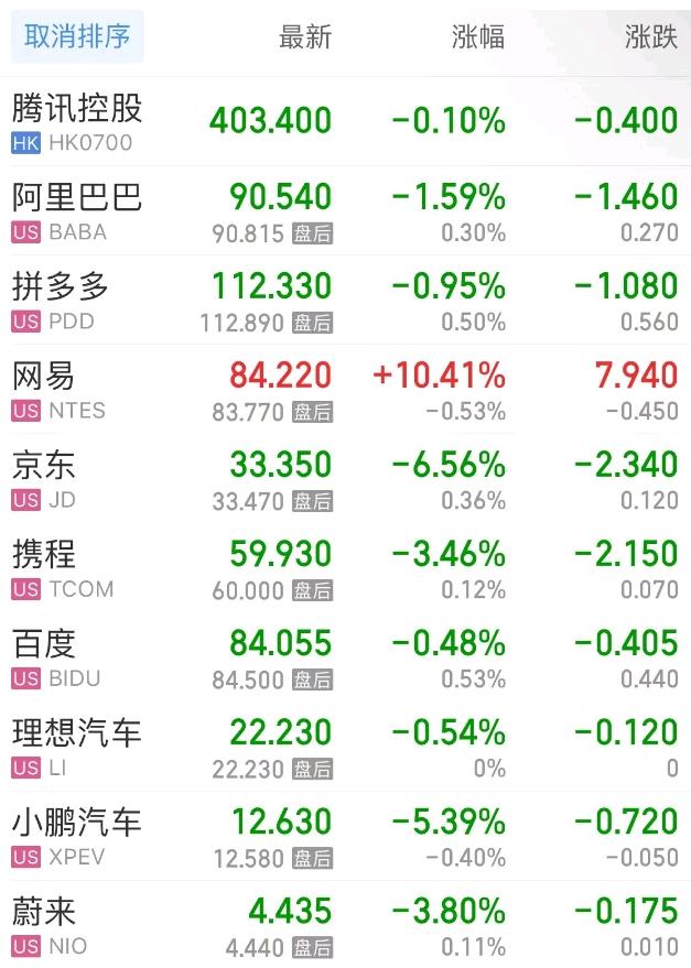 热门中概股方面,腾讯控股(港股)跌0.10%,阿里巴巴跌1.59%,拼多多跌0.95%,网易涨10.41%,携程跌3.46%,百度跌0.48%,理想汽车跌0.54%,小鹏汽车跌5.39%,蔚来跌3.80%。