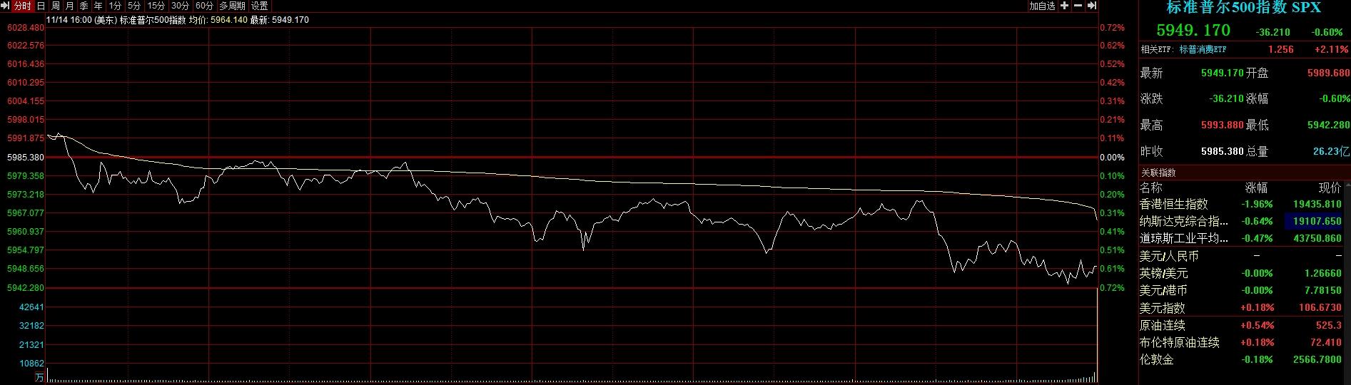 美东时间周四(11月14日),美股高开低走全线收跌,尾盘加速下滑。美联储主席鲍威尔最新讲话偏鹰派,打压市场降息预期以及投资者乐观情绪。特朗普交易继续降温,其团队计划取消7500美元的电动汽车税收抵免,美股新能车全线重挫,Rivian大跌14.3%,特斯拉跌5.77%。纳斯达克中国金龙指数跌1.8%。