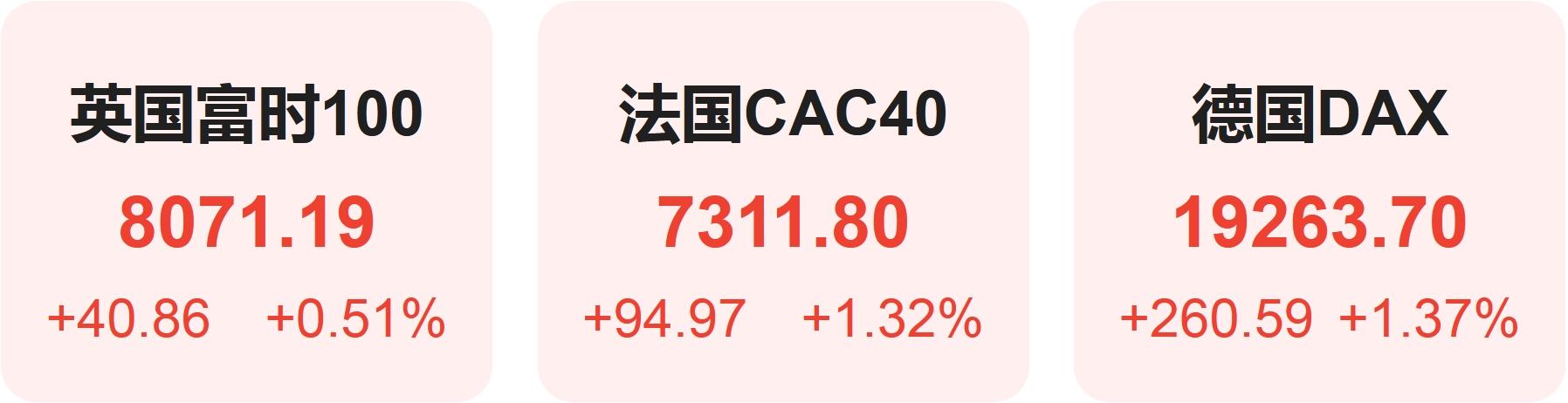 欧洲股市方面,英国富时100指数小幅上涨0.51%,报8071点。法国CAC40指数上涨1.32%,报7312点。德国DAX指数上涨1.37%,报19264点。
