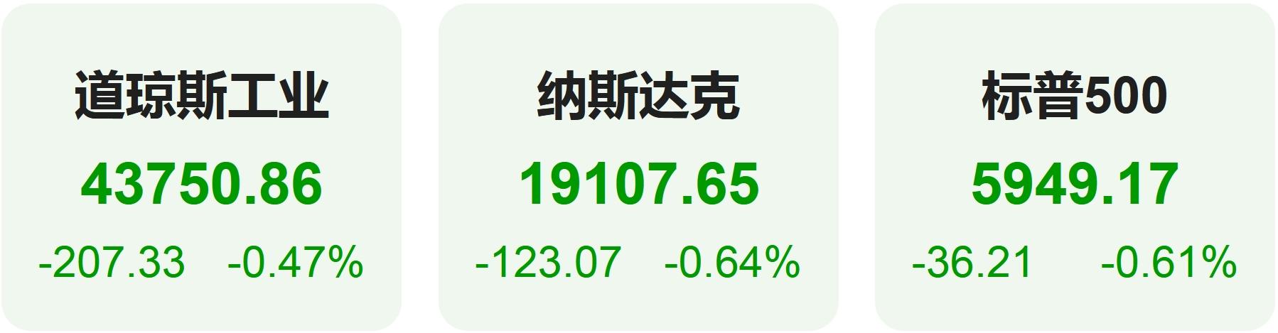 截至收盘,道指跌207.33点,跌幅为0.47%,报43750.86点;纳指跌123.07点,跌幅为0.64%,报19107.65点;标普500指数跌36.21点,跌幅为0.60%,报5949.17点。