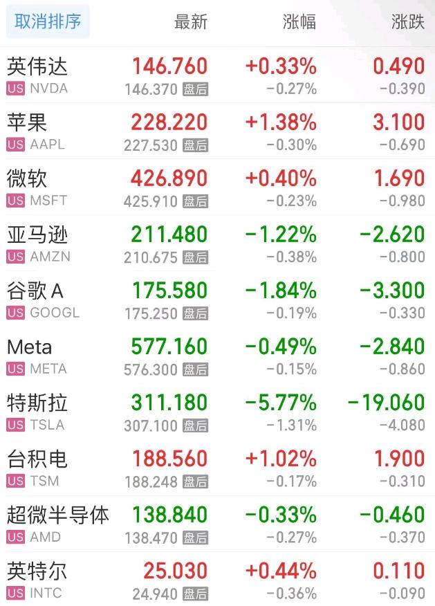 热门美股中,英伟达涨0.34%,苹果涨1.38%,微软涨0.40%,亚马逊跌1.22%,谷歌C跌1.74%,谷歌A跌1.85%,Meta跌0.49%,特斯拉跌5.77%,台积电涨1.02%,超微半导体跌0.33%,英特尔涨0.44%。