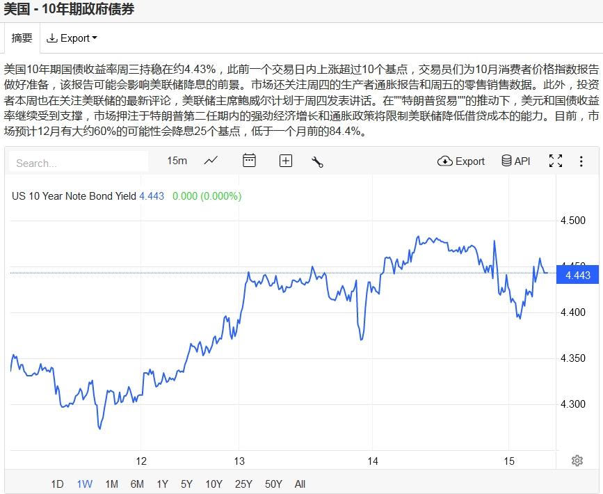 美债收益率涨跌互现,基准的10年期美债收益率收报4.443%;对货币政策更敏感的两年期美债收益率收报4.36%