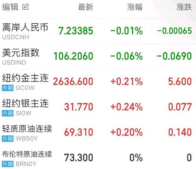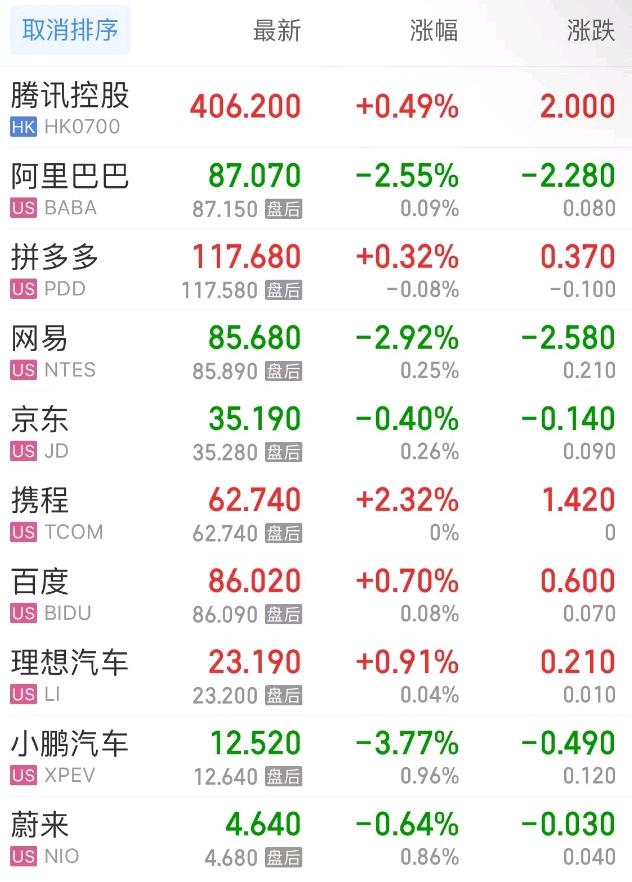 热门中概股方面,腾讯控股(港股)涨0.49%,阿里巴巴跌2.55%,拼多多涨0.32%,网易跌2.92%,携程涨2.32%,百度涨0.70%,理想汽车涨0.91%,小鹏汽车跌3.77%,蔚来跌0.64%。