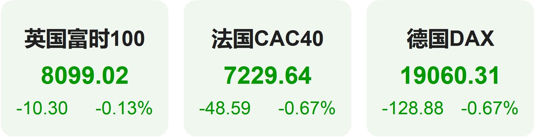 欧洲股市方面,英国富时100指数小幅下跌0.13%,报8099点。法国CAC40指数小幅下跌0.67%,报7230点。德国DAX指数小幅下跌0.67%,报19060点。