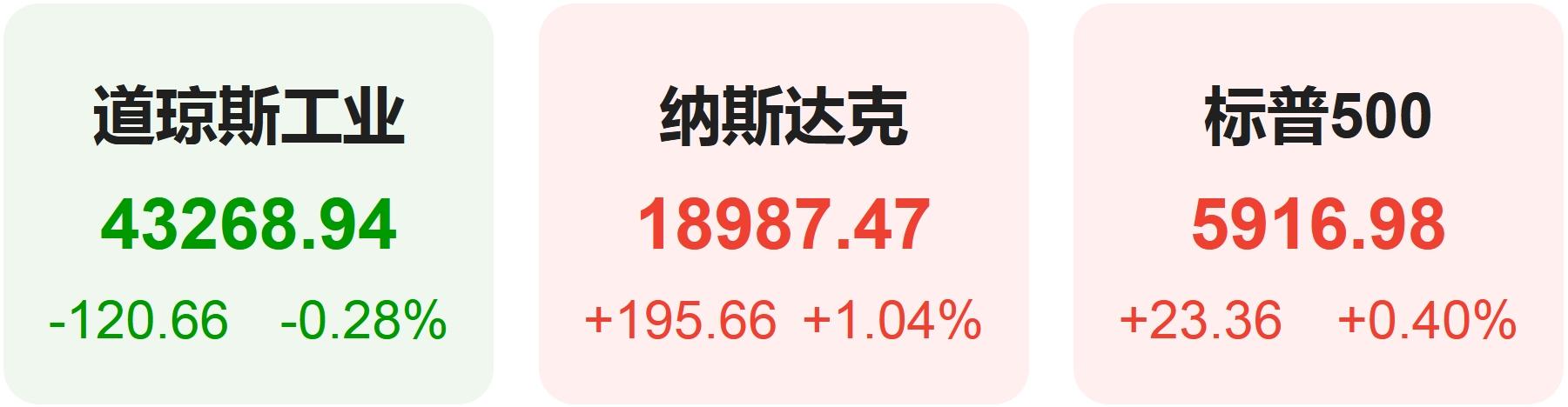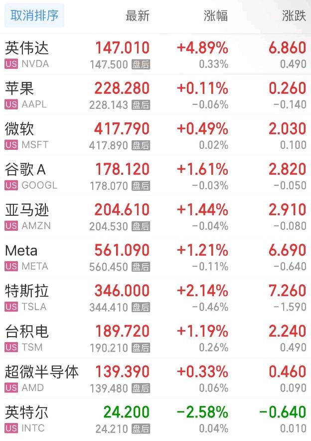 热门美股中,英伟达涨4.90%,苹果涨0.11%,微软涨0.49%,谷歌C涨1.57%,谷歌A涨1.61%,亚马逊涨1.44%,Meta涨1.21%,特斯拉涨2.14%,台积电涨1.20%,超微半导体涨0.33%,英特尔跌2.58%。