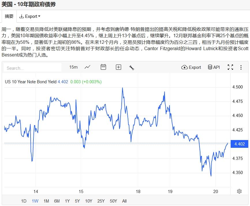 美债收益率小幅回落,基准的10年期美债收益率收报4.4020%;对货币政策更敏感的两年期美债收益率收报4.2910%。