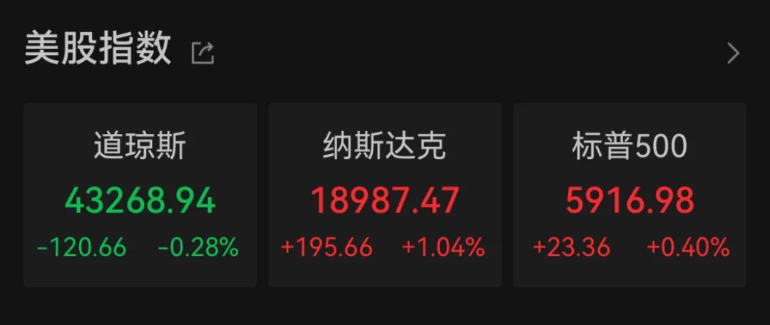 道指盘中急跌超450点,收盘跌幅收窄至0.28%报43268.94点;标普500指数涨0.4%报5916.98点,纳指涨1.04%报18987.47点。