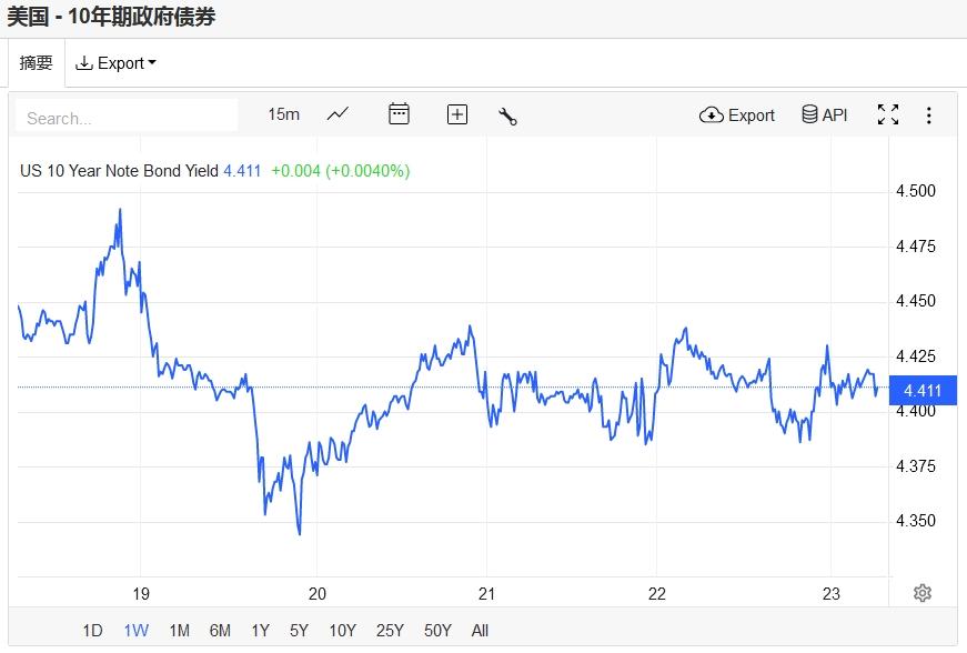 上周五,基准的10年期美债收益率收报4.4410%,全周累计下降约4个基点;对货币政策更敏感的两年期美债收益率收报4.3840%,全周累计升约7个基点。