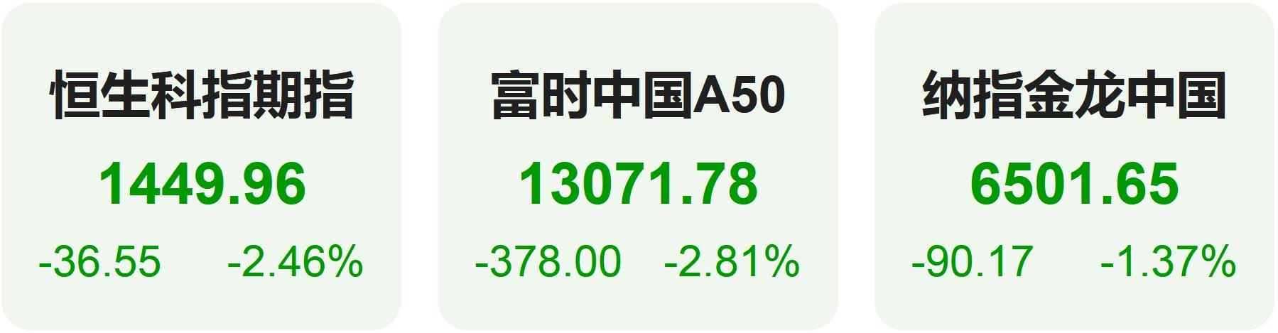 11月22日,恒生科技指数期货下跌2.46%,纳斯达克中国金龙指数下跌1.37%,富时中国A50指数下跌2.81%。