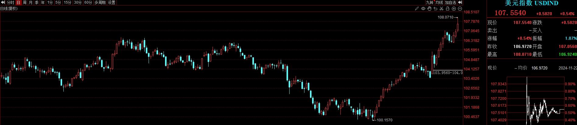 上周五,因市场普遍认为特朗普上台将提振美元,而美联储明年降息预期的削弱进一步支撑美元走势,美元指数一度冲上108关口上方,接近13个月高点,为2022年11月以来首次,最终美元指数收涨0.54%,报107.554。