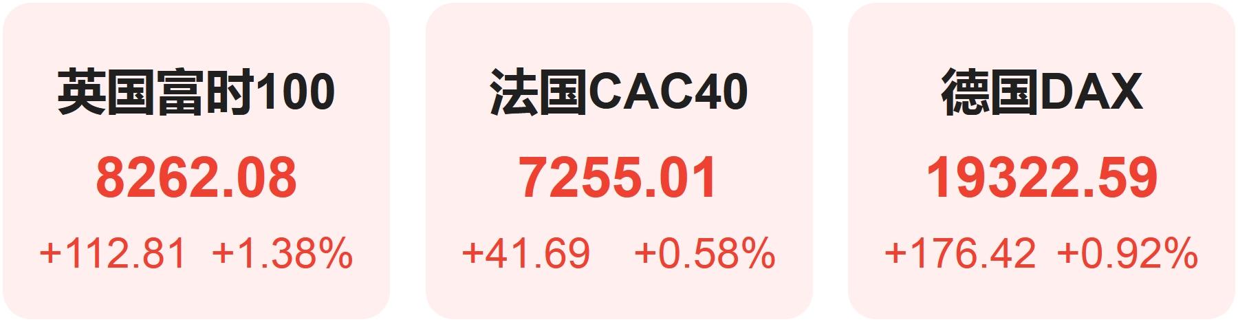 上周五,欧洲股市方面,英国富时100指数上涨1.38%,报8262点。法国CAC40指数小幅上涨0.58%,报7255点。德国DAX指数小幅上涨0.92%,报19323点。