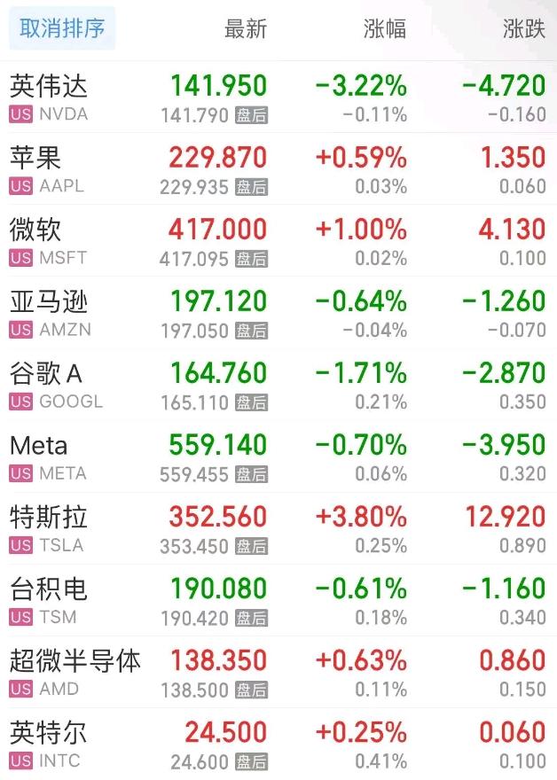 上周五,热门美股中,英伟达跌3.22%,苹果涨0.59%,微软涨1.00%,亚马逊跌0.64%,谷歌C跌1.58%,谷歌A跌1.71%,Meta跌0.70%,特斯拉涨3.80%,台积电跌0.61%,超微半导体涨0.63%,英特尔涨0.25%。