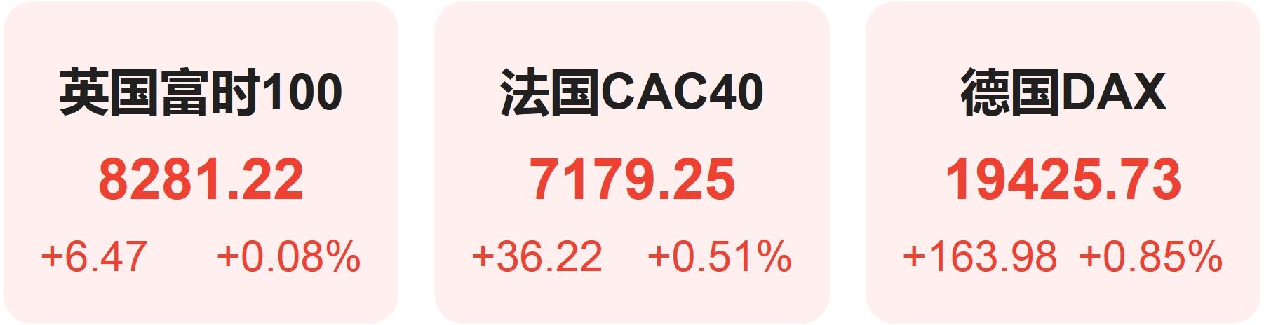 欧洲股市方面,英国富时100指数小幅上涨0.08%,报8281点。法国CAC40指数小幅上涨0.51%,报7179点。德国DAX指数小幅上涨0.85%,报19426点。