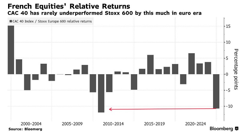 法国股债市场今年持续跑输欧洲市场的基准指数,主要因法国国内持续的政治动荡对该国股市和债券市场造成巨大压力,基准的法国10年期国债收益率有史以来首次与希腊同期限主权债券持平,均为3%。由于预算僵局可能推翻政府,法国股市预计将出现自2010年以来相对于欧洲其他国家基准股票指数以及泛欧股市基准——欧洲斯托克600指数的最差表现。