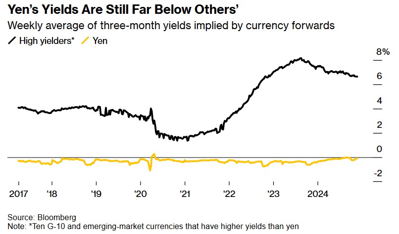 尽管日本央行正在逐步加息来提高基准利率,但日本与美国等主要经济体之间的收益率差距仍然很大。美联储在11月将基准利率下调了25个基点,至4.5%-4.75%的区间,仍然远远高于日本基准利率。根据Australia&New Zealand Banking驻悉尼的外汇分析师费利克斯.瑞安的说法,即使日本将基准利率提高到1%左右,基于日元的套利交易的逻辑仍然成立。