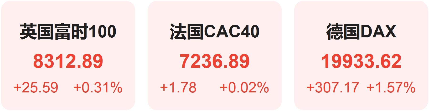 欧洲股市方面,英国富时100指数小幅上涨0.31%,报8313点。法国CAC40指数小幅上涨0.02%,报7237点。德国DAX指数上涨1.57%,报19934点。