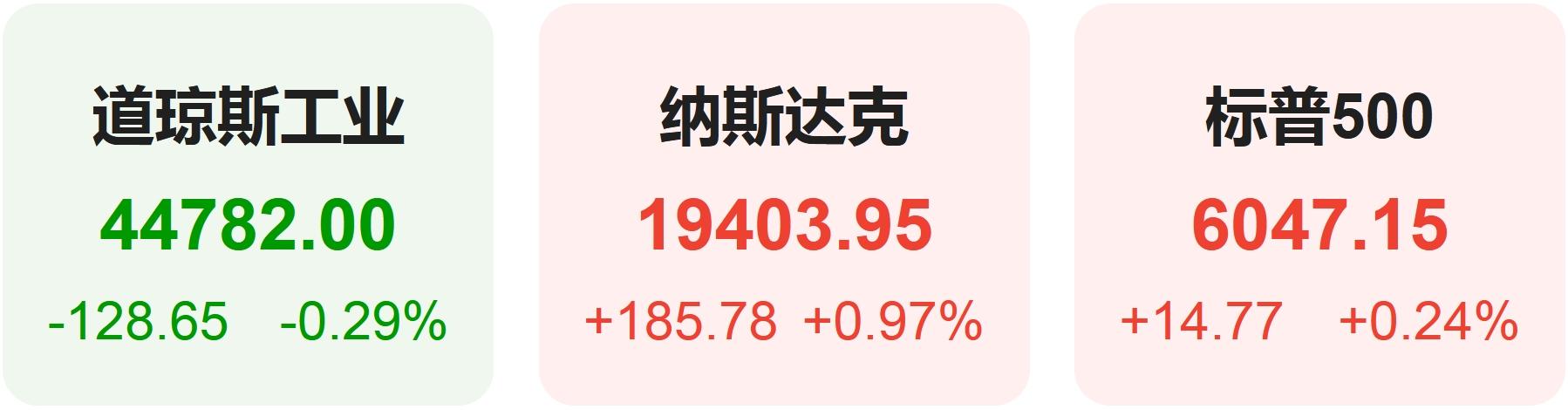 截至收盘,标准普尔500指数涨0.24%,报6047.15点;纳斯达克综合指数涨0.97%,报19403.95点;道琼斯工业平均指数跌0.29%,报44782点。