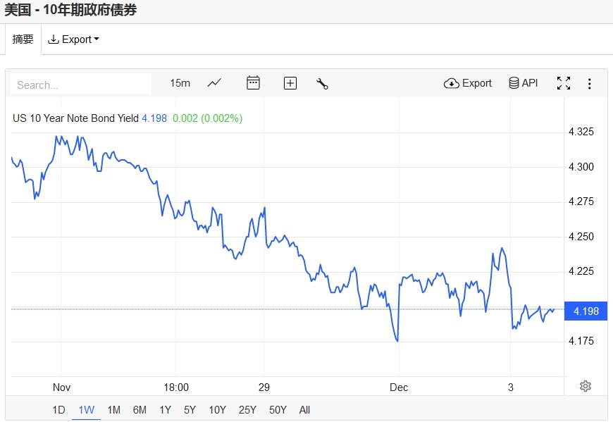 美债收益率先涨后跌,10年期美债收益率收报4.198%,对利率更加敏感的两年期美债收益率收报4.192%。