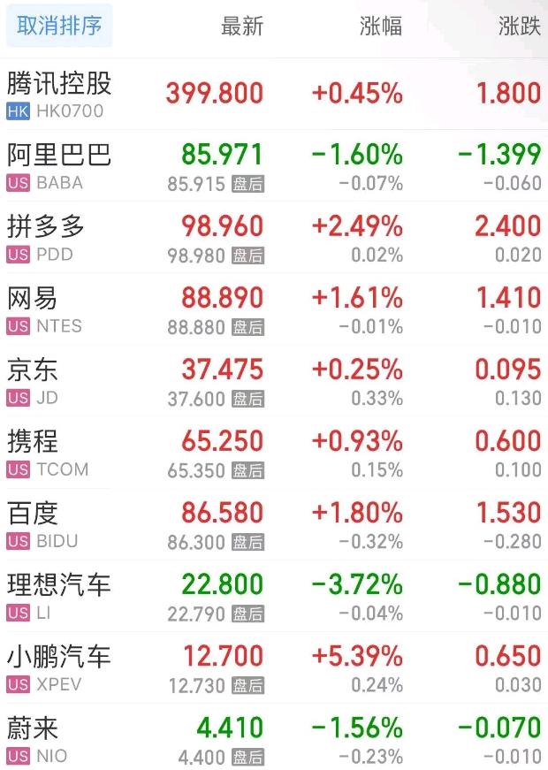 热门中概股方面,腾讯控股(港股)涨0.45%,阿里巴巴跌1.61%,拼多多涨2.51%,网易涨1.59%,携程涨0.93%,百度涨1.73%,理想汽车跌3.72%,小鹏汽车涨5.31%,蔚来跌1.79%。