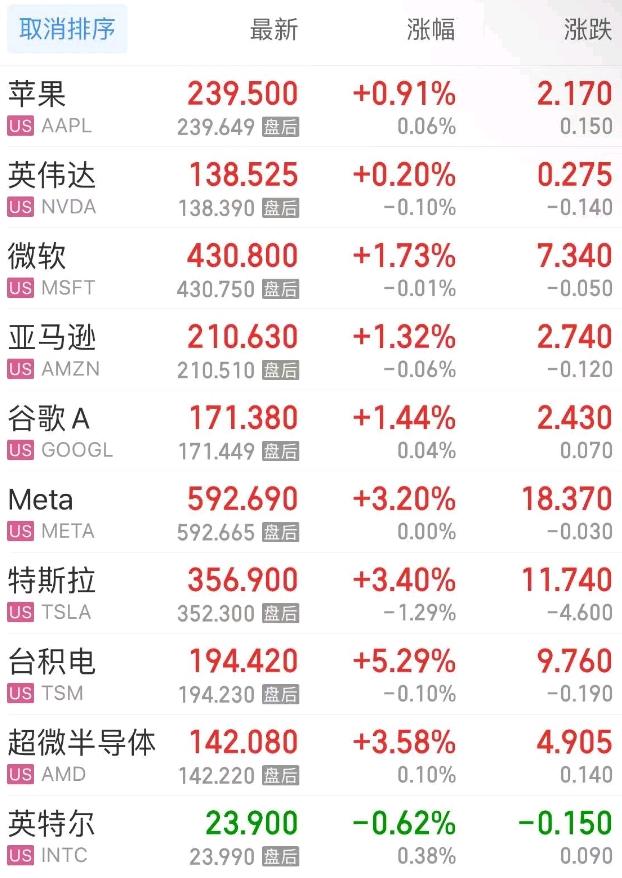 热门美股中,苹果涨0.95%,英伟达涨0.28%,微软涨1.78%,亚马逊涨1.36%,谷歌C涨1.46%,谷歌A涨1.50%,Meta涨3.22%,特斯拉涨3.46%,台积电涨5.30%,超微半导体涨3.56%,英特尔跌0.50%。