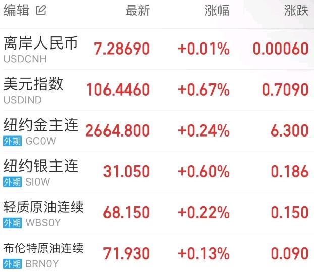 周一,美元指数开盘上涨,收复106关口,最终收涨0.67%,报106.446。
