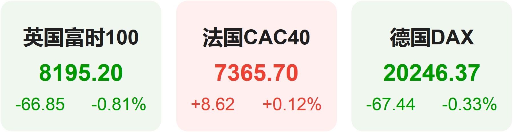 欧洲股市方面,英国富时100指数小幅下跌0.81%,报8195点。法国CAC40指数小幅上涨0.12%,报7366点。德国DAX指数小幅下跌0.33%,报20246点。