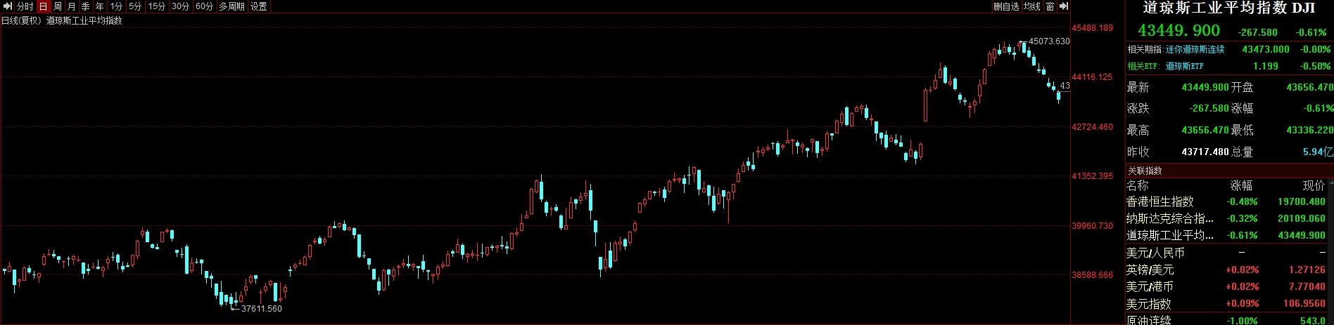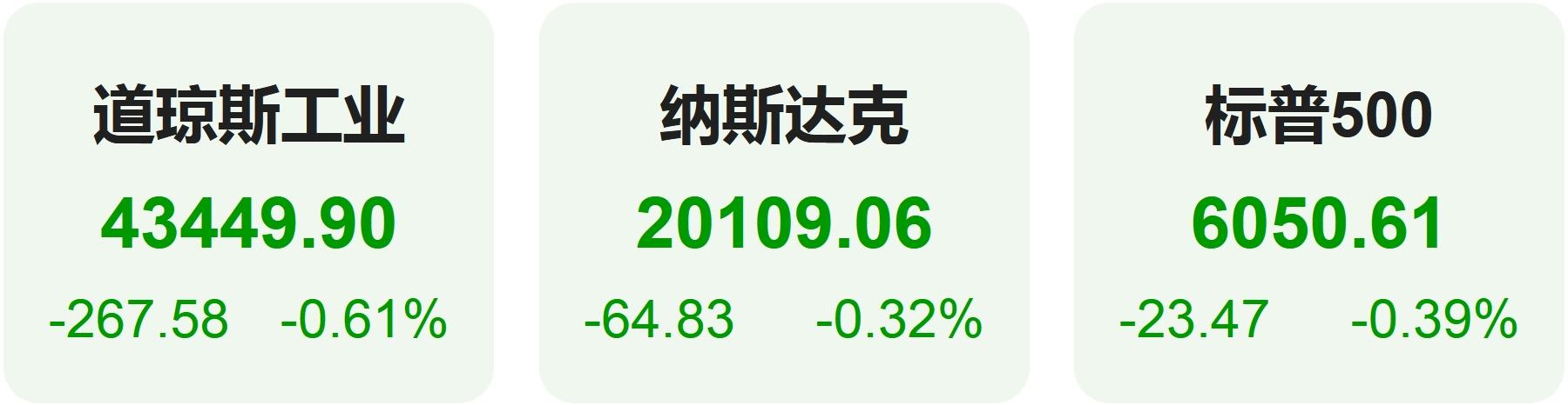 截至收盘,道琼斯指数跌0.61%,报43,449.90点;标普500指数跌0.39%,报6,050.61点;纳斯达克指数跌0.32%,报20,109.06点。