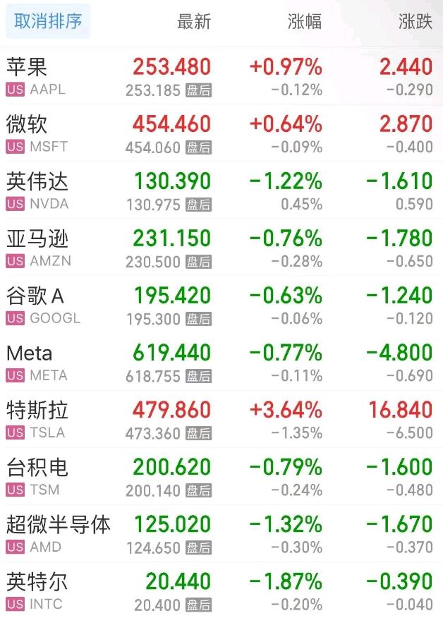 热门美股中,苹果涨0.97%,微软涨0.64%,英伟达跌1.22%,亚马逊跌0.76%,谷歌C跌0.53%,谷歌A跌0.63%,Meta跌0.77%,特斯拉涨3.64%,台积电跌0.79%,超微半导体跌1.32%。