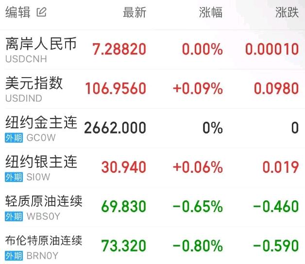 热门中概股方面,腾讯控股(港股)跌0.74%,阿里巴巴涨1.27%,拼多多涨2.82%,网易涨0.31%,携程涨2.83%,百度涨2.08%,理想汽车涨2.75%,小鹏汽车涨3.55%,蔚来涨2.83%。