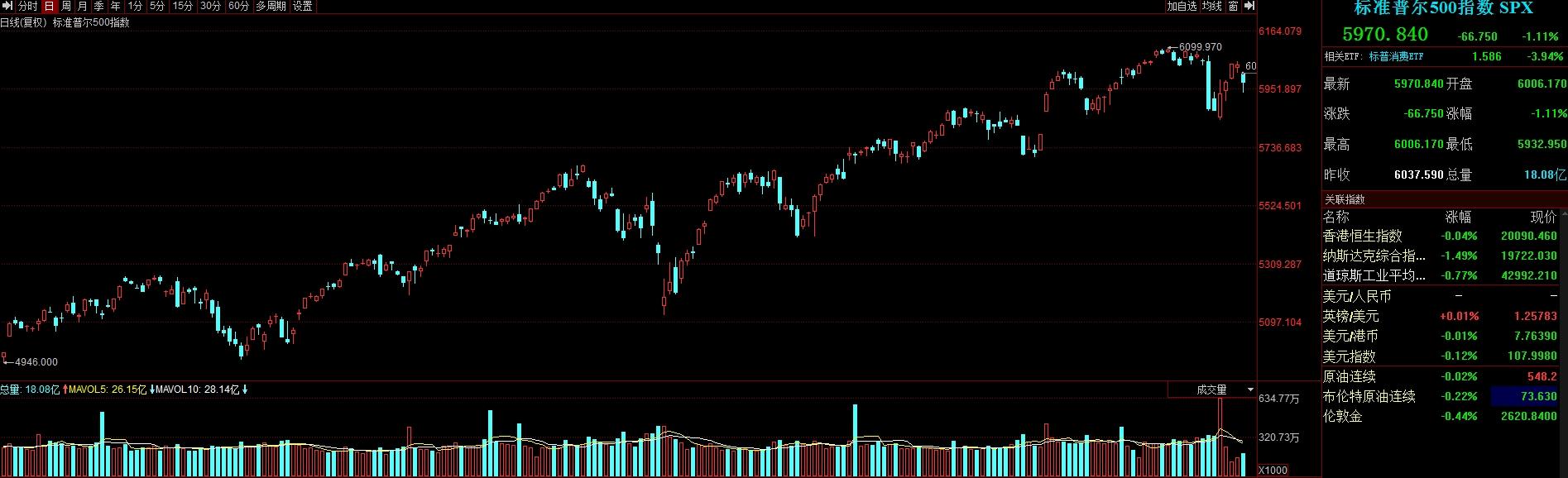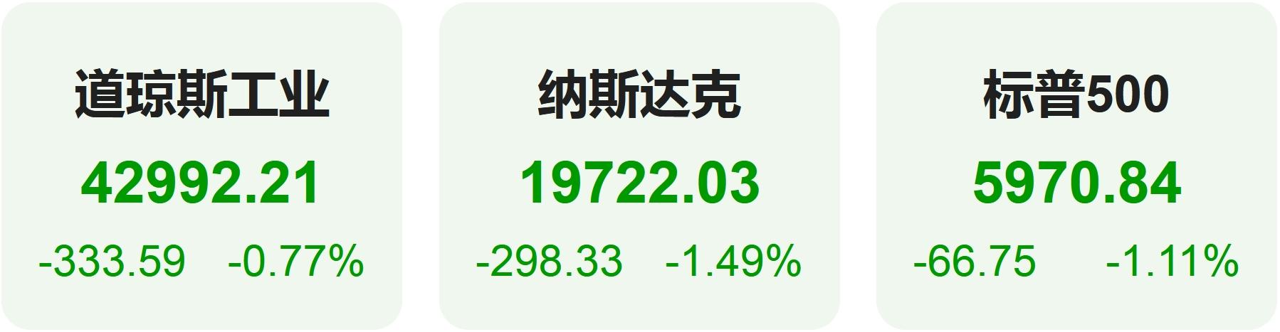 截至上周五收盘,道琼斯指数跌0.77%,报42,992.21点;标普500指数跌1.11%,报5,970.84点;纳斯达克综合指数跌1.49%,报19,722.03点,再度失守2万点大关。
