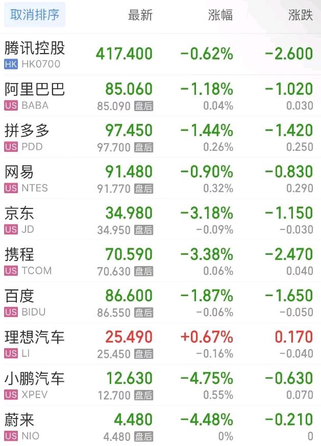 上周五热门中概股方面,腾讯控股(港股)跌0.62%,阿里巴巴跌1.18%,拼多多跌1.44%,网易跌0.90%,携程跌3.38%,百度跌1.87%,理想汽车涨0.67%,小鹏汽车跌4.75%,蔚来跌4.48%。