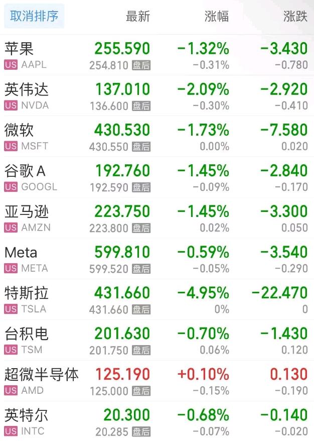 上周五,热门美股中,苹果跌1.32%,英伟达跌2.09%,微软跌1.73%,谷歌C跌1.55%,谷歌A跌1.45%,亚马逊跌1.45%,Meta跌0.59%,特斯拉跌4.95%,台积电跌0.70%,超微半导体涨0.10%。
