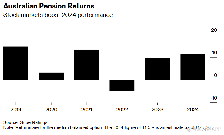 根据研究机构SuperRatings的估计,受全球股市强劲反弹的推动,澳大利亚规模达4.1万亿澳元(2.6万亿美元)的养老基金行业在2024年实现了两位数的回报。