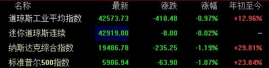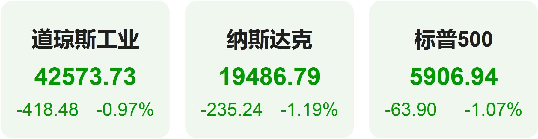 截至周一收盘,标准普尔500指数跌1.07%,报5906.94点;纳斯达克综合指数跌1.19%,报19486.78点;道琼斯工业平均指数跌0.97%,报42573.73点。