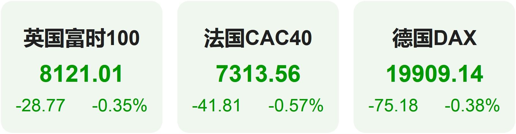 欧洲股市方面,英国富时100指数小幅下跌0.35%,报8121点。法国CAC40指数小幅下跌0.57%,报7314点。德国DAX指数小幅下跌0.38%,报19909点。