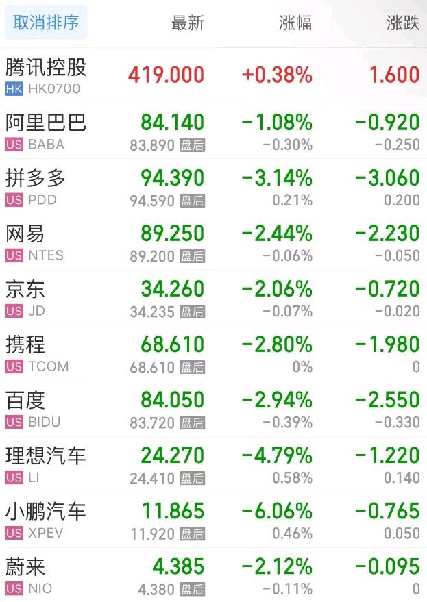 热门中概股方面,腾讯控股(港股)涨0.38%,阿里巴巴跌1.08%,拼多多跌3.14%,网易跌2.44%,携程跌2.81%,百度跌2.95%,理想汽车跌4.79%,小鹏汽车跌6.06%,蔚来跌2.12%。