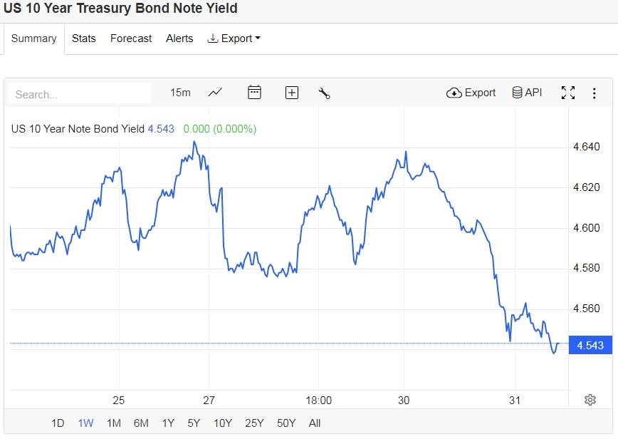 美债收益率下跌,基准的10年期美债收益率收报4.543%;对货币政策更敏感的两年期美债收益率收报4.2600%。