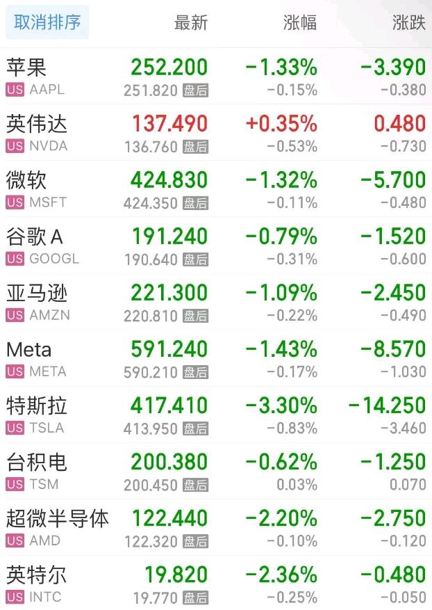热门美股中,苹果跌1.33%,英伟达涨0.35%,微软跌1.32%,谷歌C跌0.70%,谷歌A跌0.79%,亚马逊跌1.10%,Meta跌1.43%,特斯拉跌3.30%,台积电跌0.62%,超微半导体跌2.20%。