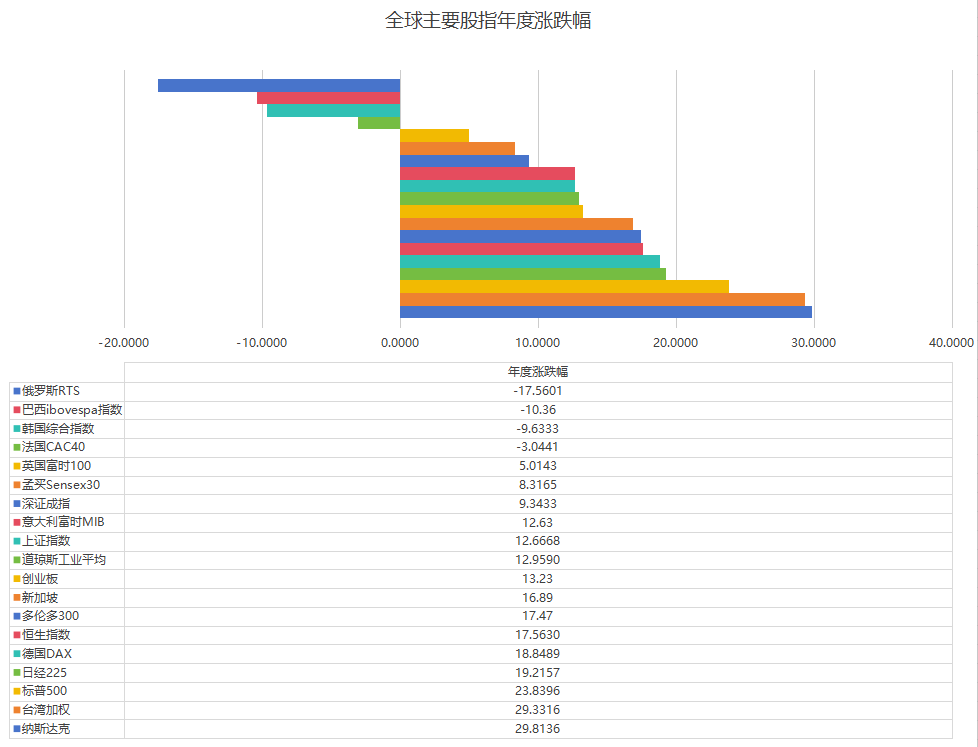 具体来看,纳斯达克指数以29.81%涨幅独占全球市场鳌头;而亚太主要市场中,台湾加权指数涨29.33%,日经225指数上涨19.22%,恒指指数和新加坡指数分别以17.56%和16.89%的涨幅名列亚太股指前列,而韩国综合指数以-9.63%在亚太股指中垫底。