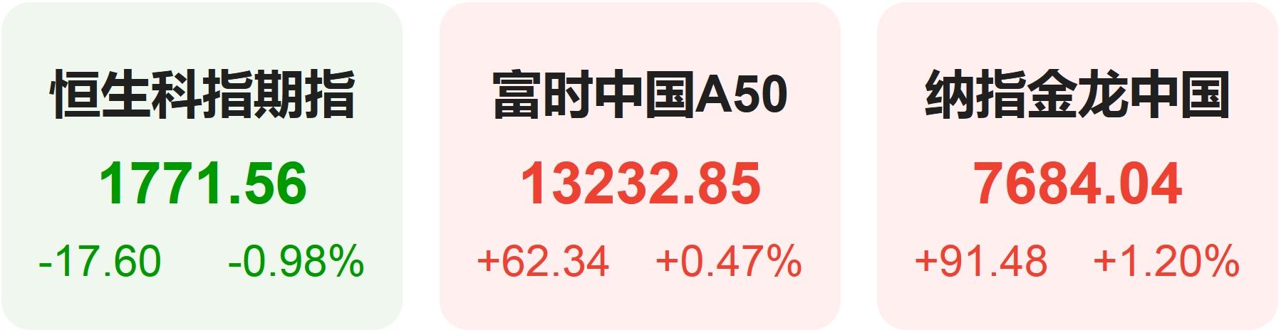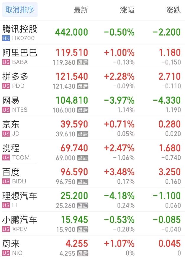热门中概股方面,腾讯控股(港股)跌0.50%,阿里巴巴涨1.00%,拼多多涨2.28%,网易跌3.97%,携程涨2.47%,百度涨3.48%,理想汽车跌4.18%,小鹏汽车跌0.53%,蔚来涨1.07%。