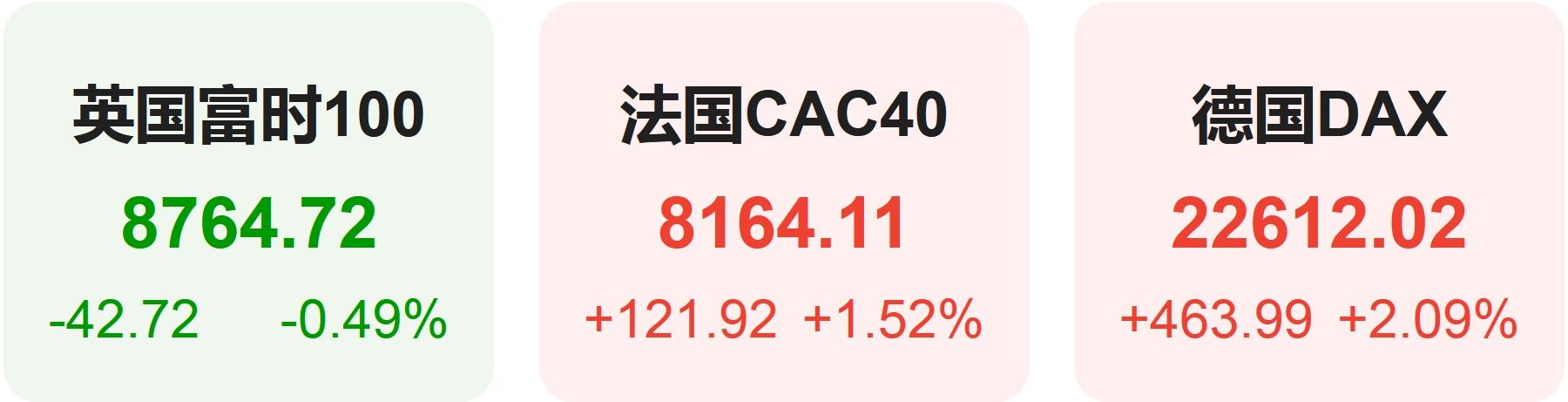 欧洲股市方面,英国富时100指数小幅下跌0.49%,报8765点。法国CAC40指数上涨1.52%,报8164点。德国DAX指数大涨2.09%,报22612点。