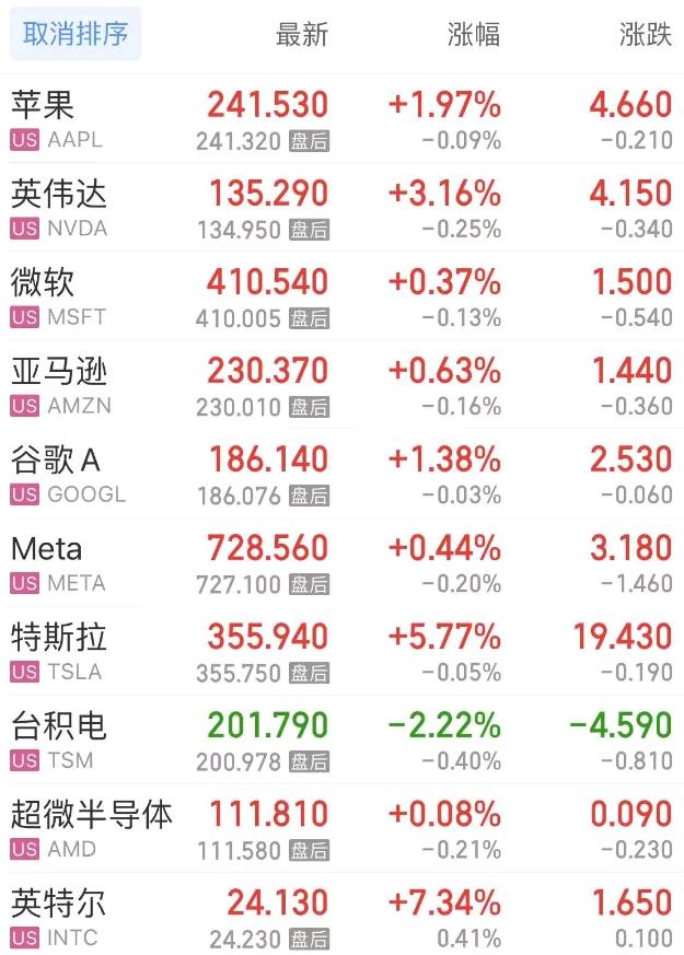 热门美股中,苹果涨1.97%,英伟达涨3.17%,微软涨0.37%,亚马逊涨0.63%,谷歌C涨1.32%,谷歌A涨1.38%,Meta涨0.44%,特斯拉涨5.77%,台积电跌2.22%,超微半导体涨0.08%,英特尔涨7.34%。