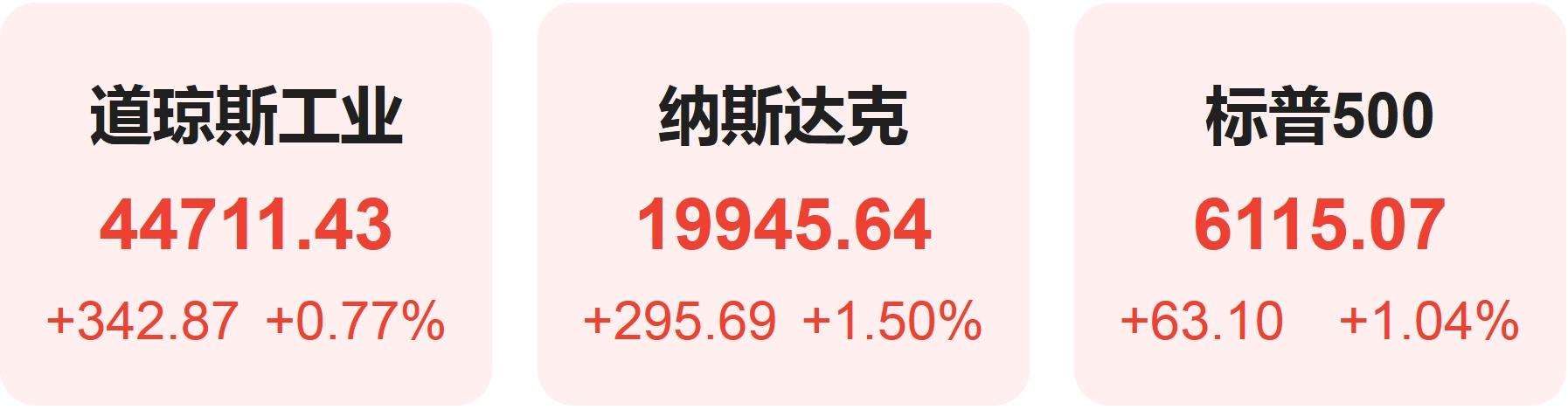 截至收盘,道琼斯指数涨0.77%,报44,711.43点;标普500指数涨1.04%,报6,115.07点,逼近纪录高位;纳斯达克指数涨1.50%,报19,945.64点。