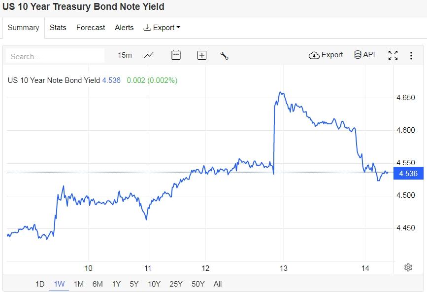 美债收益率回落,基准的10年期美债收益率收报4.5360%,对货币政策更敏感的两年期美债收益率收报4.3210%。